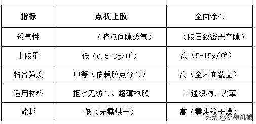以下是针对热熔胶复合机中点状上胶与全面涂布两种工艺的透气性对比实验分析,综合行业技术原理与应用数据: