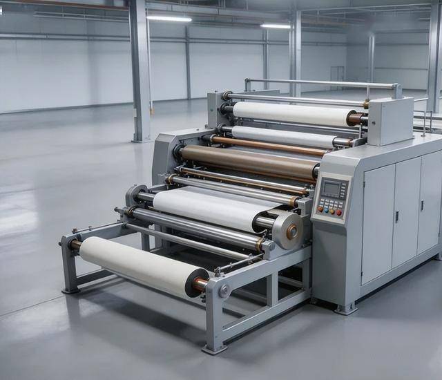4. 复合压辊+烘箱/熟化:控温(80–160℃)、线压可调,溶剂/水分挥发、胶层固化;